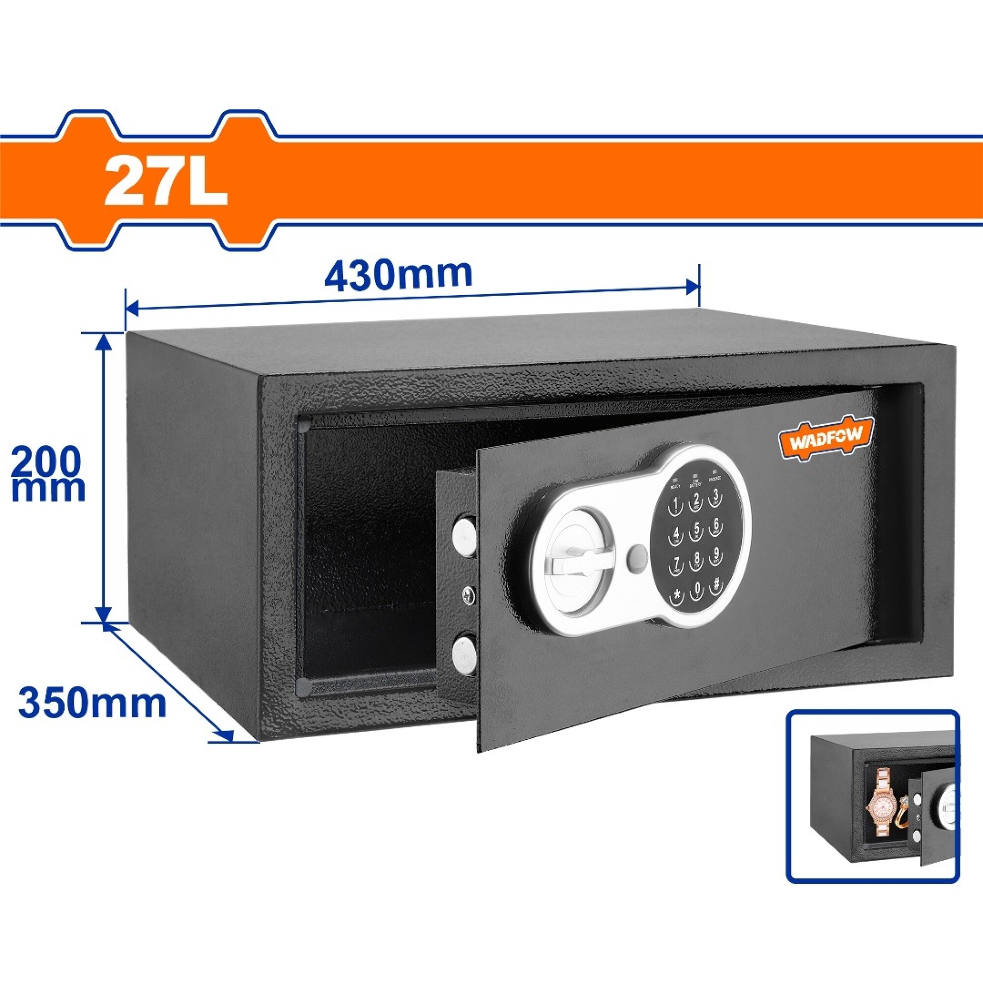 WADFOWCaja Fuerte Digital Wadfow WEB1535 27L Universo Binario -Dimensiones Exteriores: 8"*17*14". -Volumen:27l -Grosor Panel De La Puerta: 3mm -Grosor Cuerpo De La Caja: 1.5mm -Se Puede Registrar Código De 3 A 8 Dígitos Libremente -Peso Neto:9kg -Montaje:Se Puede Fijar A La Pared O Al Suelo -Incluye: *1 X Caja Fuerte *2 X Llave Mecánica *1 X Manual De Usuario / Instrucciones De Montaje *4 X Perno De Expansión Embalado En Caja De Color6976057339629001https://universobinario.com/catalogo/caja-fuerte-digital-wadfow-web1535-27l-universo-binario_6976057339629_001