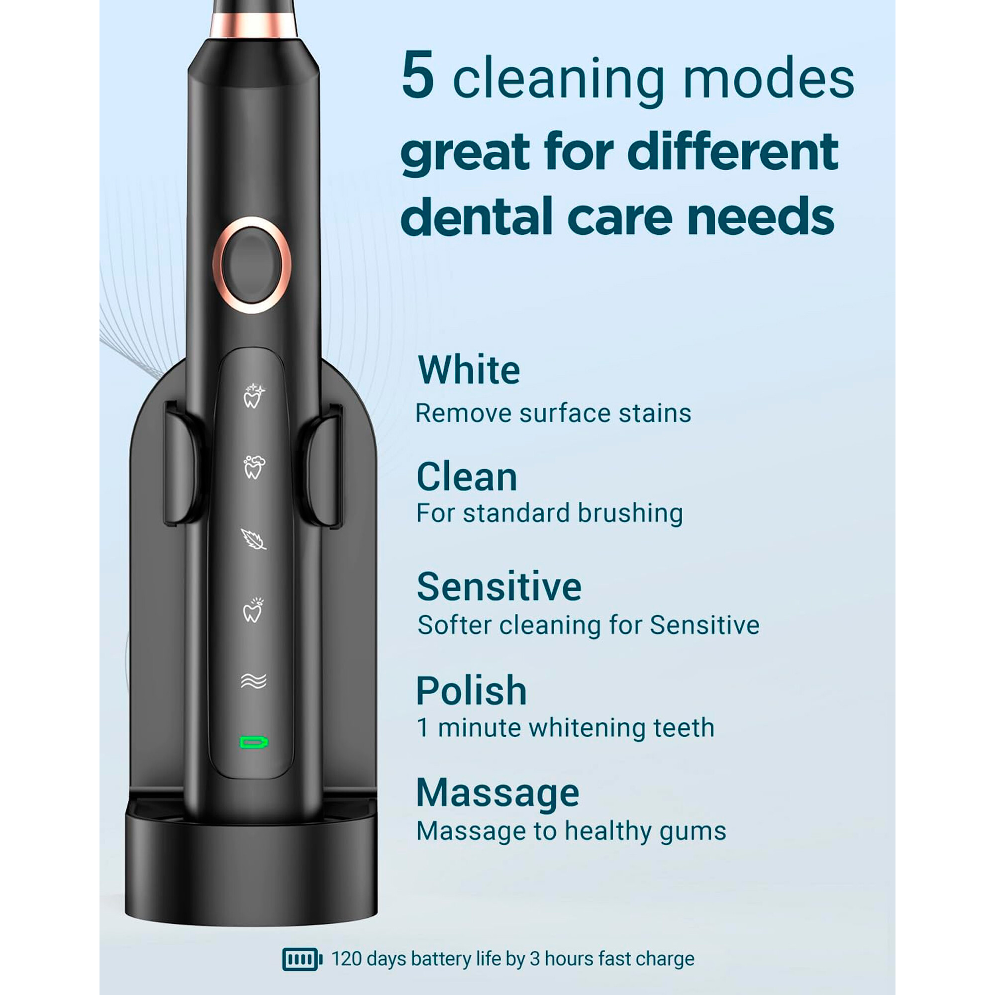 -p--span style="color: #000000;"--strong--span style="font-size: 14pt;"-RTAUYS - CEPILLO DE DIENTES EL Eacute;CTRICO -/span--/strong--br /--strong--span style="font-size: 14pt;"-M5 SONIC-/span--/strong--br /--br /--strong-Poder de limpieza superior.-/strong--br /-Ofrece una impresionante potencia de 41000 vibraciones de alta frecuencia por minuto, proporcionando una limpieza profunda y completa, 5 veces m aacute;s eficaz que los cepillos de dientes el eacute;ctricos de baja frecuencia, tanto para adultos como para ni ntilde;os. Elimina hasta 5 veces m aacute;s placa y manchas superficiales para una sonrisa m aacute;s sana y brillante.-br /--br /--strong-Cepillo de dientes el eacute;ctrico blanqueador.-/strong--br /-La avanzada tecnolog iacute;a de blanqueamiento ayuda a blanquear los dientes con el uso constante, para una sonrisa m aacute;s radiante. El temporizador integrado de 2 minutos y la funci oacute;n de recordatorio de 30 segundos garantizan un tiempo de cepillado cient iacute;ficamente recomendado, y los 5 modos de cepillado ofrecen una experiencia de limpieza personalizada que se adapta a tus necesidades uacute;nicas de cuidado bucal.-br /--br /--strong-5 modos de cepillado para todas las necesidades de cuidado bucal.-/strong--br /-Ofrece 5 modos de cepillado diferentes: limpieza, blanqueamiento, dientes sensibles, cuidado de las enc iacute;as y masaje, para satisfacer diversas necesidades de limpieza y cuidado. Tambi eacute;n se puede apagar el cepillo de dientes el eacute;ctrico en cualquier modo manteniendo pulsado el bot oacute;n durante 2 segundos.-br /--br /--strong-120 d iacute;as de duraci oacute;n de la bater iacute;a y pr aacute;ctico para viajar.-/strong--br /-Solo necesita 3 horas para cargarse por completo y puede durar hasta 120 d iacute;as de uso. Su elegante y port aacute;til estuche de viaje y soporte lo convierten en el cepillo de dientes el eacute;ctrico ideal para viajes, para que siempre se pueda mantener una buena higiene bucal.-br /--br /--span style="color: #ff6600;"-Potencia: 41000 vpm (alta frecuencia).-/span--br /-Bater iacute;a: 120 d iacute;as APROX.-br /-Color: NEGRO.-br /--/span--span style="color: #000000;"--br /-Garant iacute;a: 1 a ntilde;o.-br /-Contra Defecto de nbsp;Fabricaci oacute;n.-br /--/span--/p-
