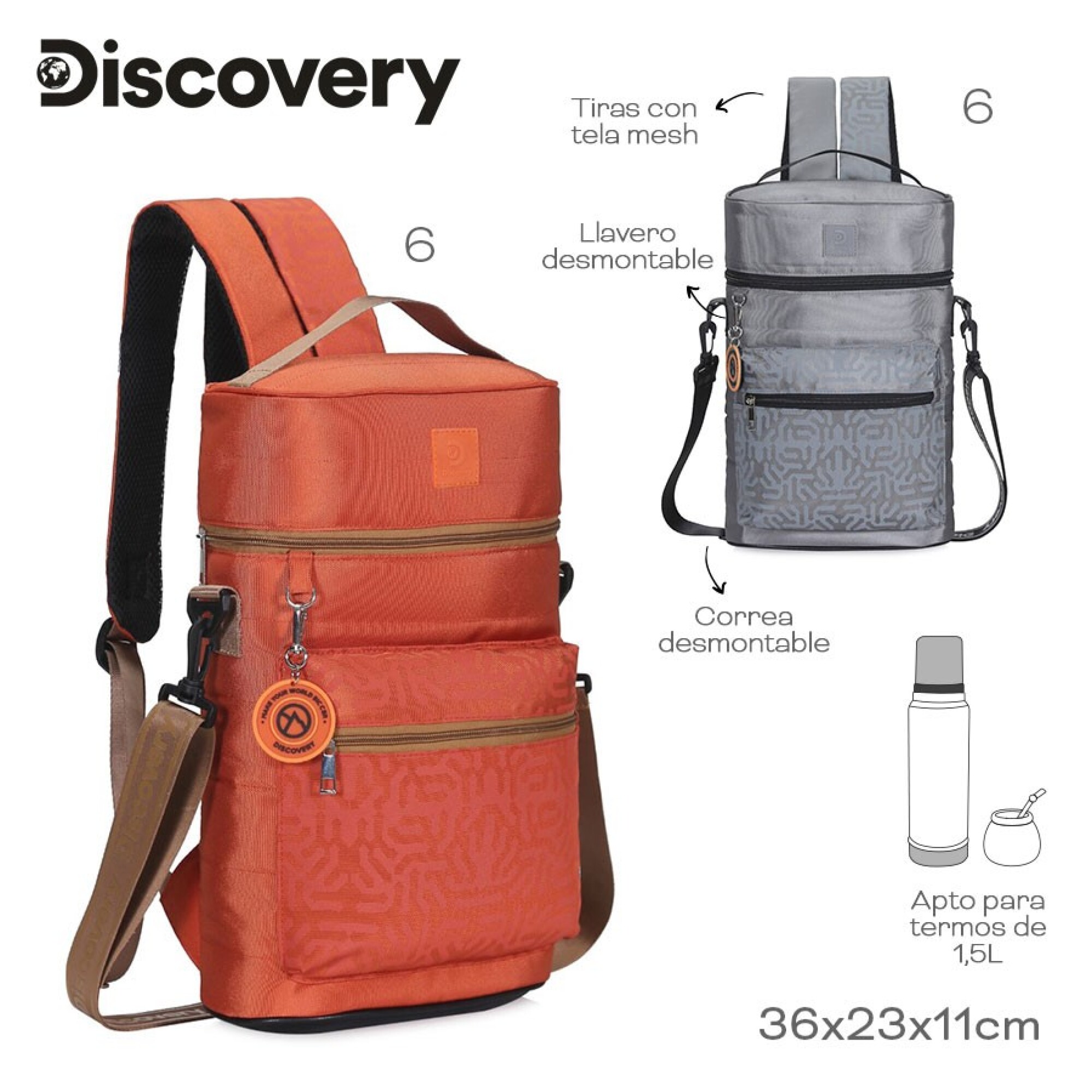 Mochila Matera Discovery Acolchada en Color Gris, Confeccionada en Material Resistente y Diseñada para Transportar Termo, Mate y Accesorios de Forma Práctica. Dispone de Compartimento Principal con Cierre, Espacio Apto para Termos de Hasta 1,5 L, Bolsillo Frontal, Llavero Desmontable y Correas Acolchadas con Tela Mesh Que Brindan Comodidad. Medidas: 36 × 23 × 11 Cm.