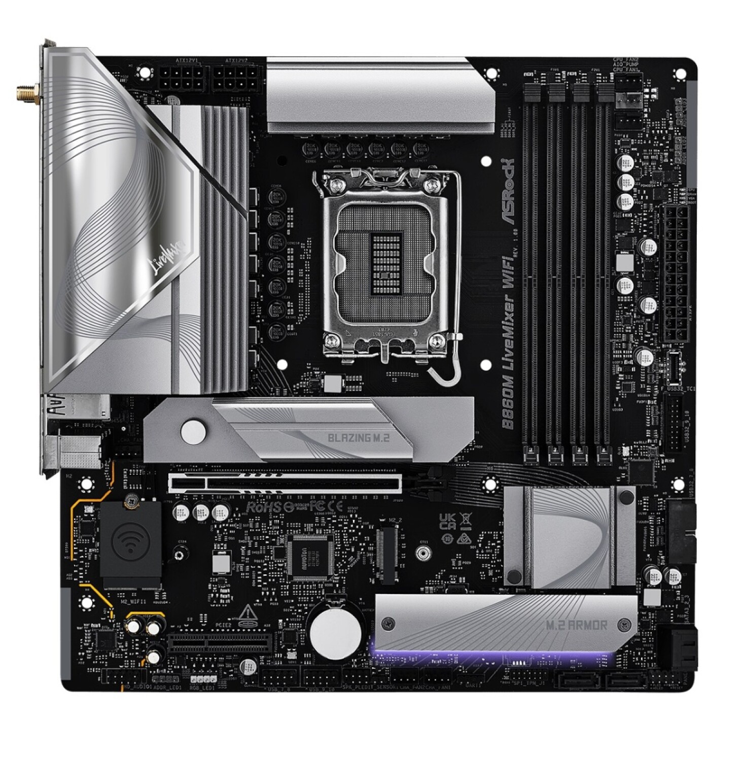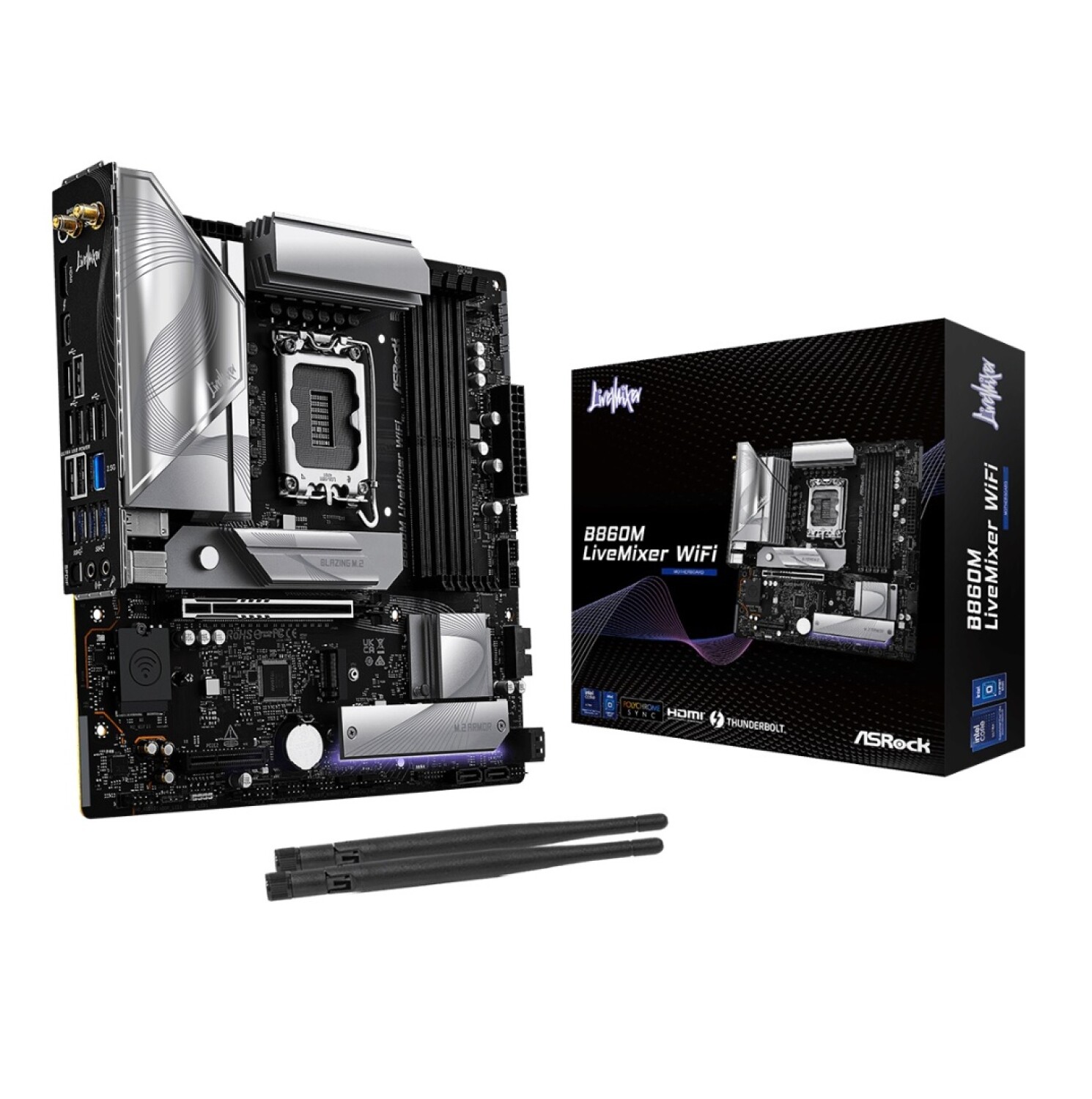 Universo BinarioMother Asrock B860 Livemixer Lga 1851 Wifi 6 Socket 1851 Intel Ultra. DDR5. RGB Formato: Micro ATXCompatibilidad: Procesadores Intel Ultra (Series 2)Socket: 1851Chipset: Intel B860Memoria: DDR5 (quad channel)Almacenamiento: 1 x Blaxing M.2, 2 x Hyper M.2, 4 x Sata 3Graficos: Intel Xe LPGAudio: Realtek High Definition 7.1 integradoPCIe 5.0 X16 - 4.0 X1Conector RGBZocalo compatible con el módulo WiFi/BTConector de alimentacion: ATX de 24 pinesConectores:1 x HDMI1 x Puerto de salida Óptico SPDIF1 x Thunderbolt 4/USB4 Type-C Port (40 Gb/s)6 x USB 3.2 Gen16 x USB 2.01 x RJ-452 x Puertos de antena1 x Interruptor Flashback del BIOS1 x Línea de salida Jack (Gold Audio Jack)1 x Línea de entrada de micrófono Jack (Gold Audio Jack)MOT202001https://universobinario.com/catalogo/mother-asrock-b860-livemixer-lga-1851-wifi-6_MOT202_001