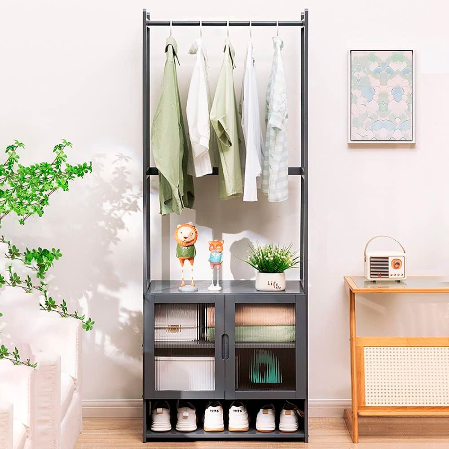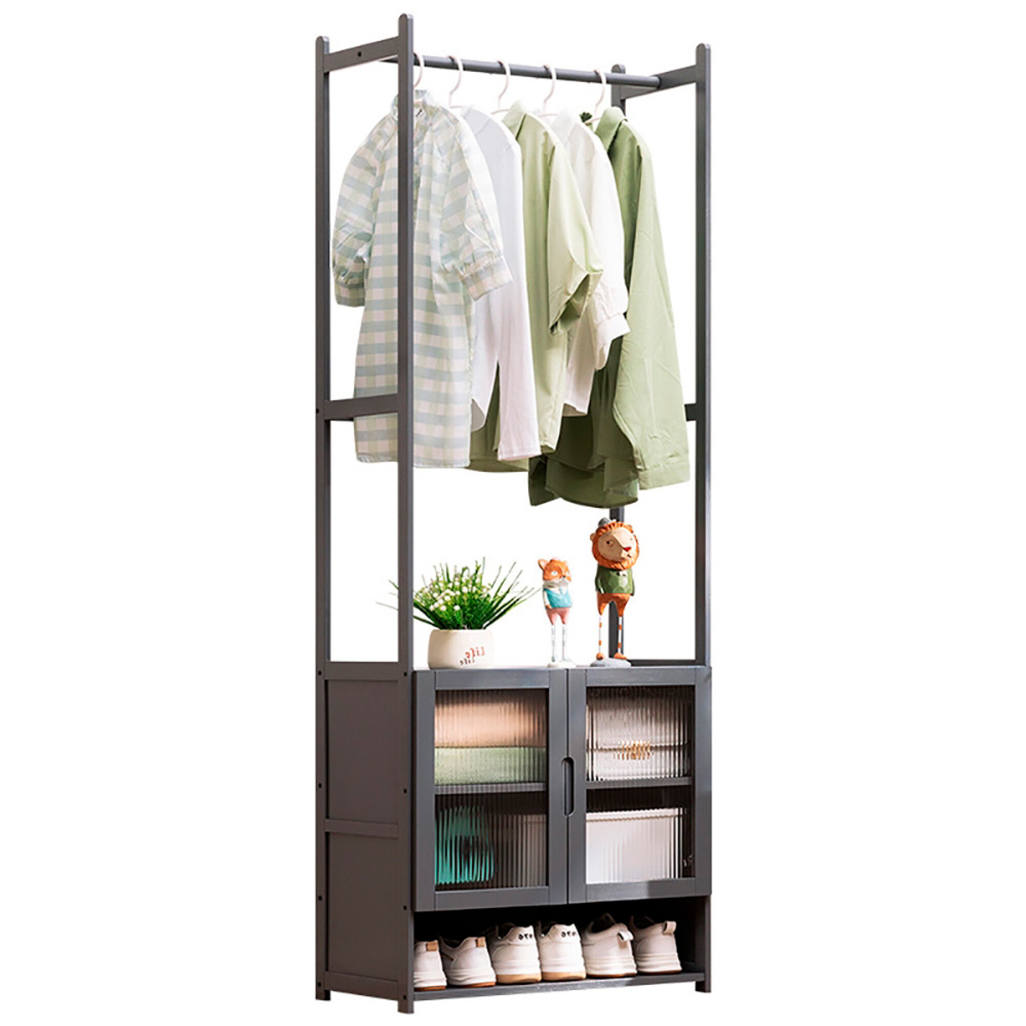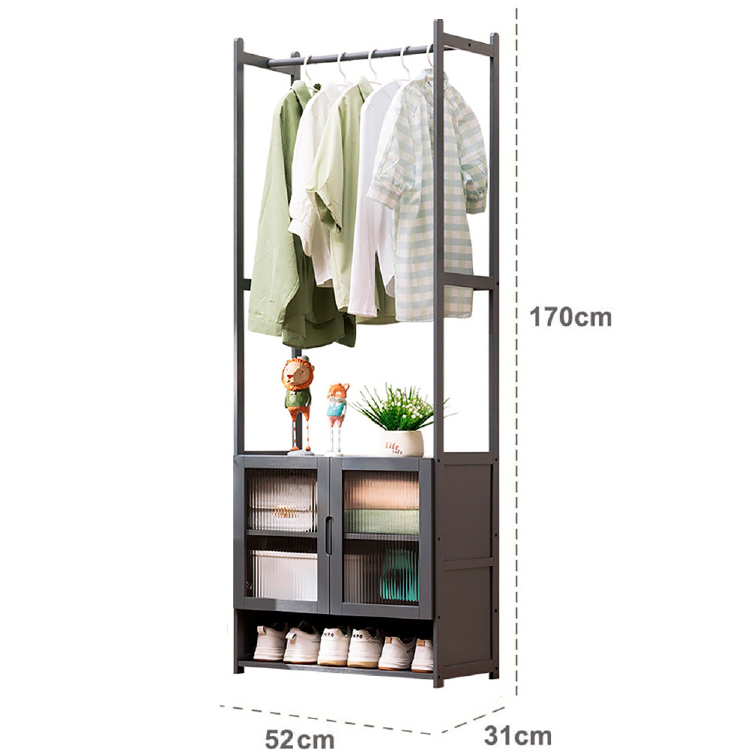 No disponible para retiro Color Gris Material Bambú Tamaño 52 X 31 X 170cm Peso 8 Kg 1 Barra Para Perchas 3 Estantes (2 Con Puertas) 1 Zapatera Inferior