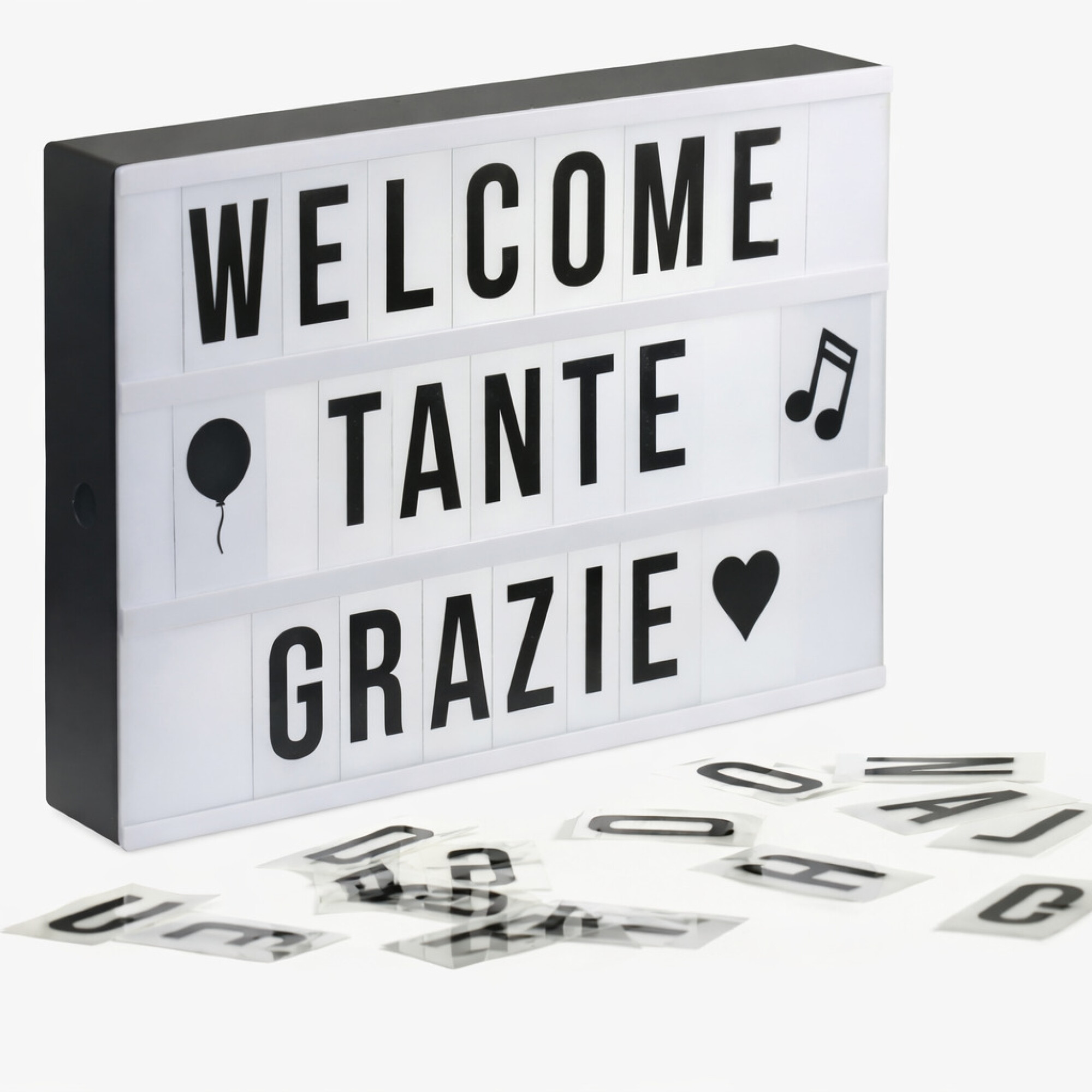 Pizarra luminosa LED que ofrece 95 caracteres (letras y simbolos) para componer mensajes personalizados y creativos. Dimensiones compactas de 20x15 cm, ideal para decorar espacios festivos, locales comerciales o eventos especiales. Funciona con pilas o carga USB, brindando flexibilidad según tus necesidades. Crea frases originales que capten la atención con elegancia y estilo.