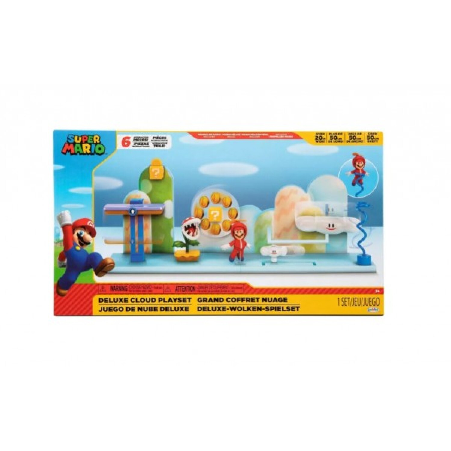 El Deluxe Cloud Playset Te Permite Disfrutar de Este Divertido y Soñador Escenario Inspirado en los Videojuegos de Super Mario. Cree sus Propias Aventuras con la Figura Propeller Mario Incluida y Navegue a Través de los Numerosos Obstáculos. en Este Juego se Incluyen Seis Piezas Ambientales Interactivas con Mecanismos de Trabajo. Gira Propeller Mario en el Soporte en Espiral y Salta de Nube en Nube Recogiendo Monedas, ¡Pero Ten Cuidado con la Planta Piraña Que Mastica! Incluso Puede Cambiar la Escena Moviéndose Alrededor de la Plataforma Intercambiable, la Planta Piraña y el Soporte en Espiral a su Gusto.