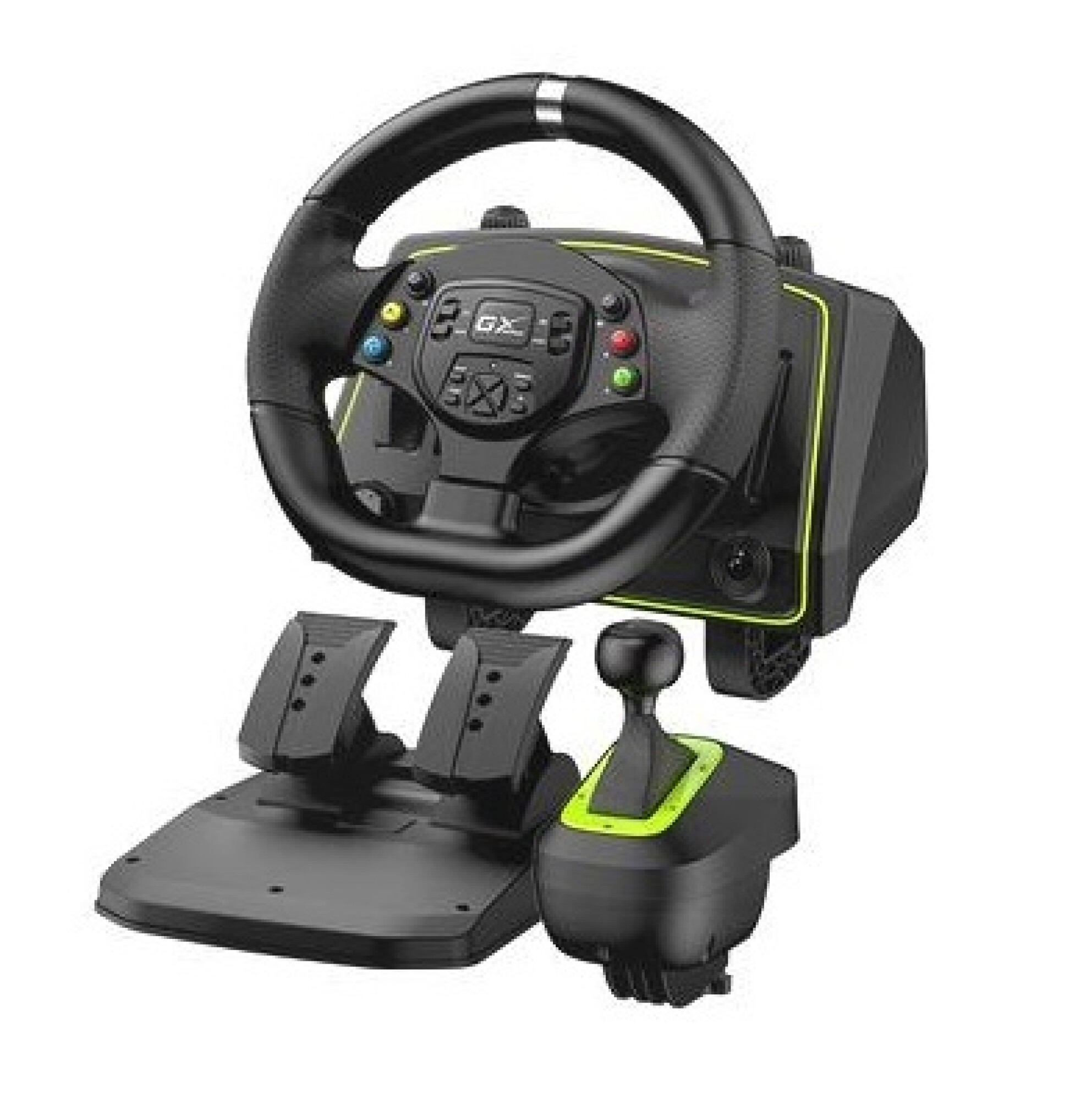 Open Box. Volante de carreras con vibración de 1080° NOTA: El empaque se encuentra en mal estado, pero el producto es nuevo y en perfectas condiciones.Color: NegroInterfaz de conexión: USBVibracionPlayStation 4 / Xbox Series X / Xbox One/Xbox 360 y Nintendo SwitchPlataforma de PC: (entrada D / entrada X)Grado de rotación de la rueda: 1080 gradosPalanca de cambiosJuego de pedales: 2 pedales (acelerar/frenar)Botones de función: Sí (Seleccionar / Iniciar)Peso: 3.8 kilogramosMedidas (An x Al x Pr): 310,5 x 271,7 x 299,5 mmMedidas pedalera (An x Al x Pr): 240 x 220 x 131,8 mm